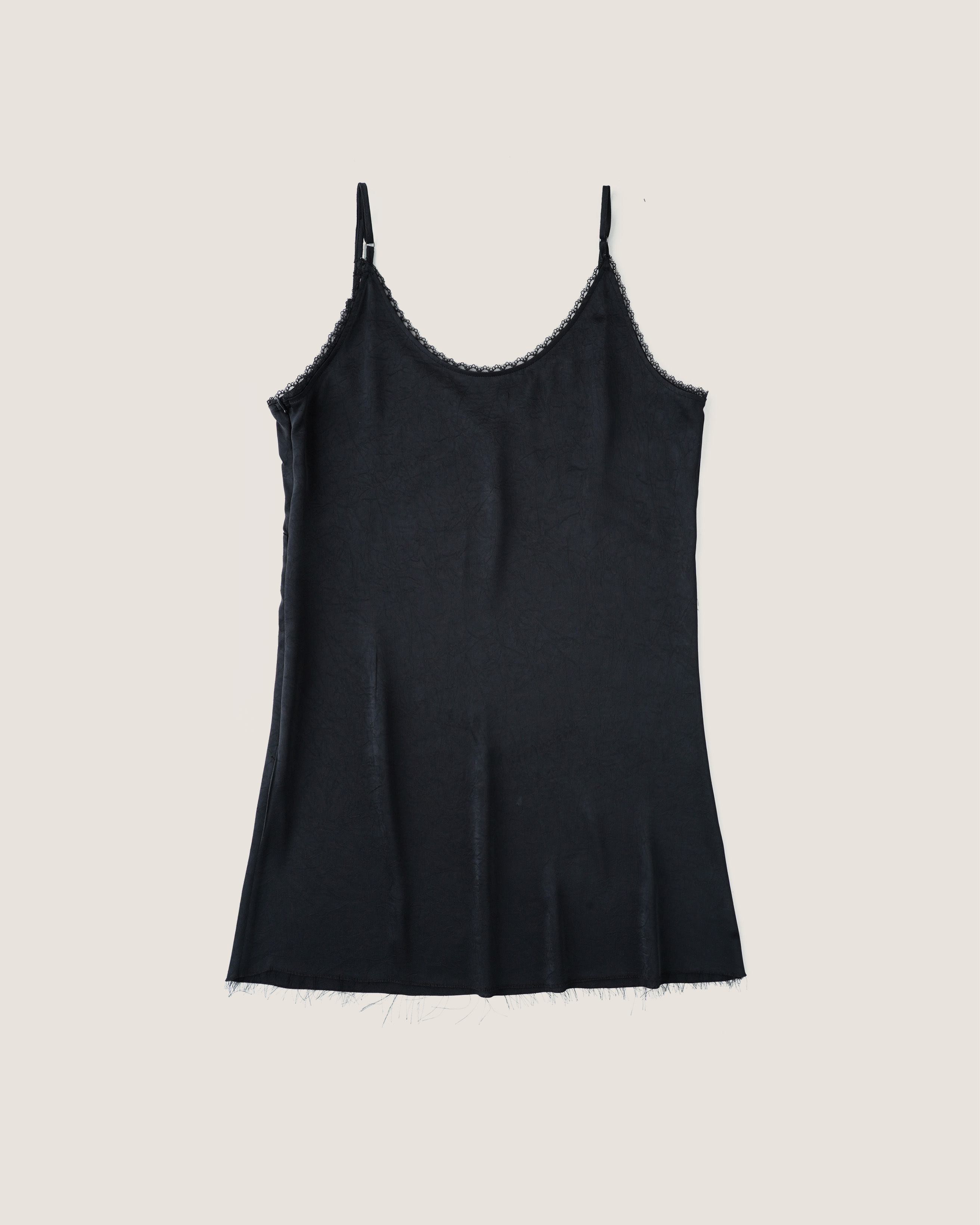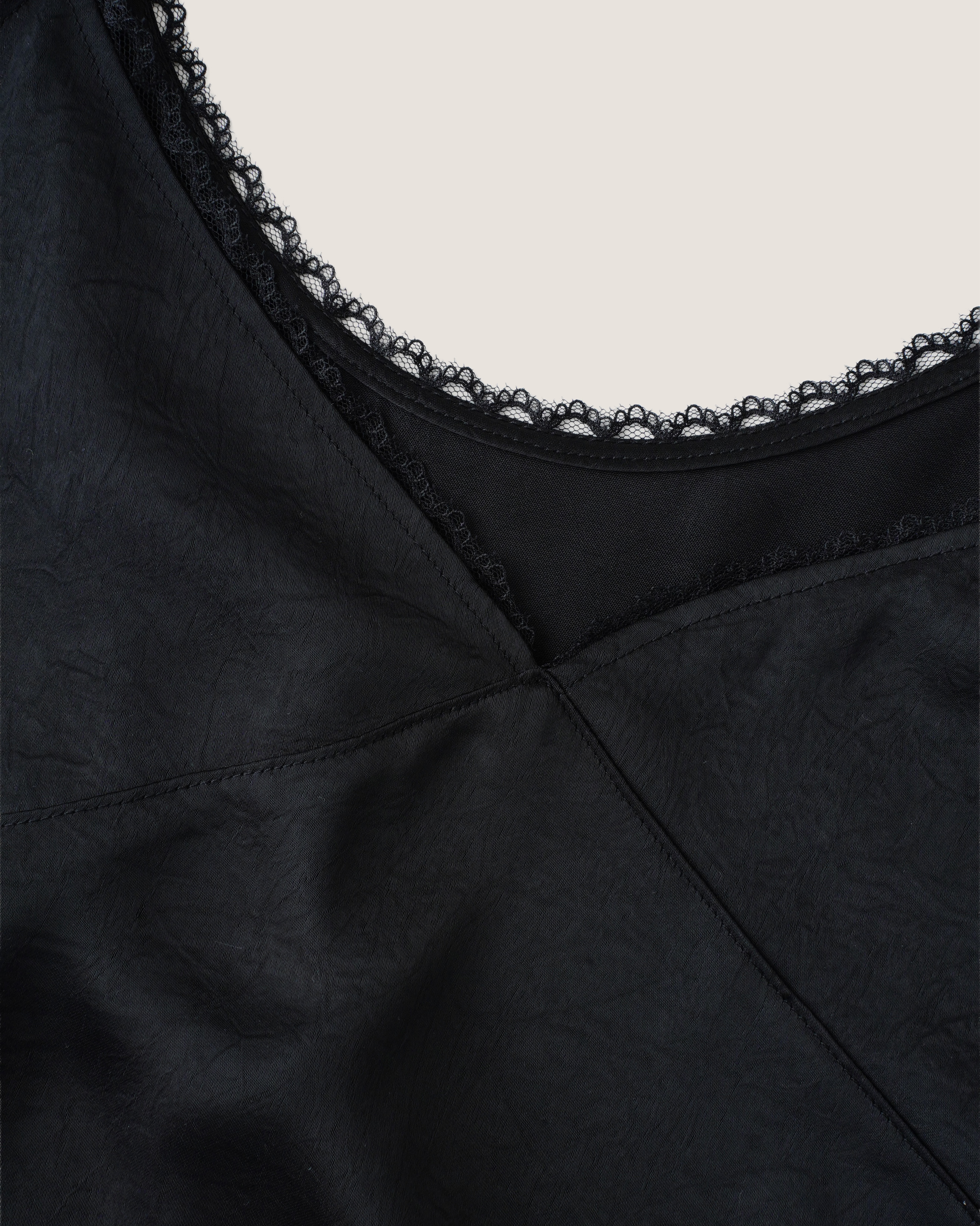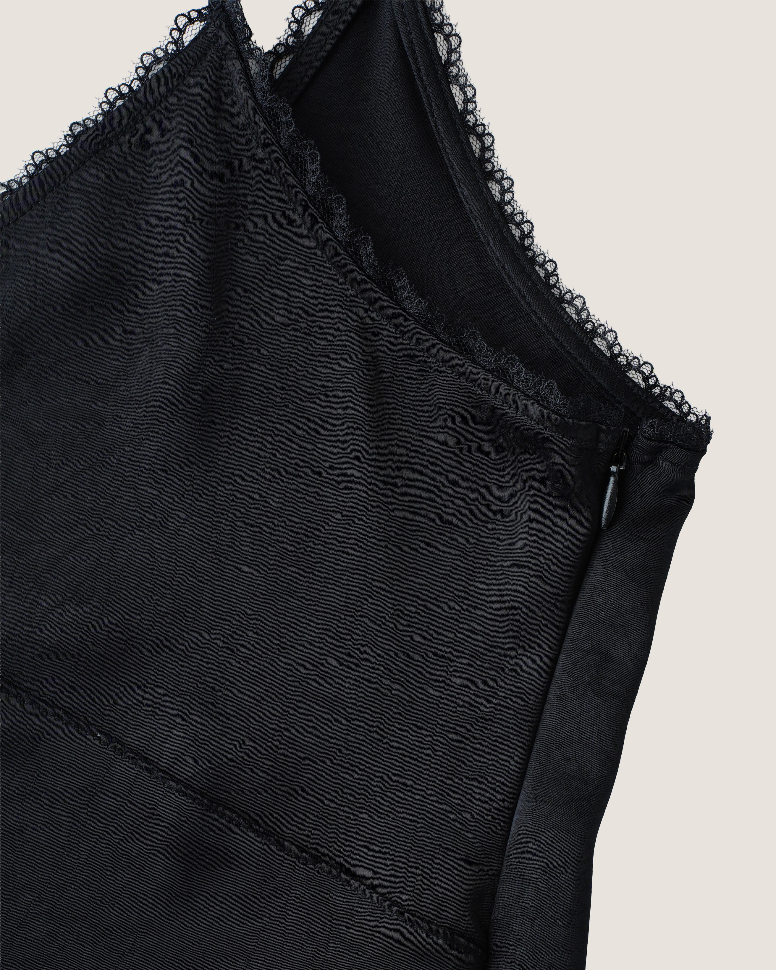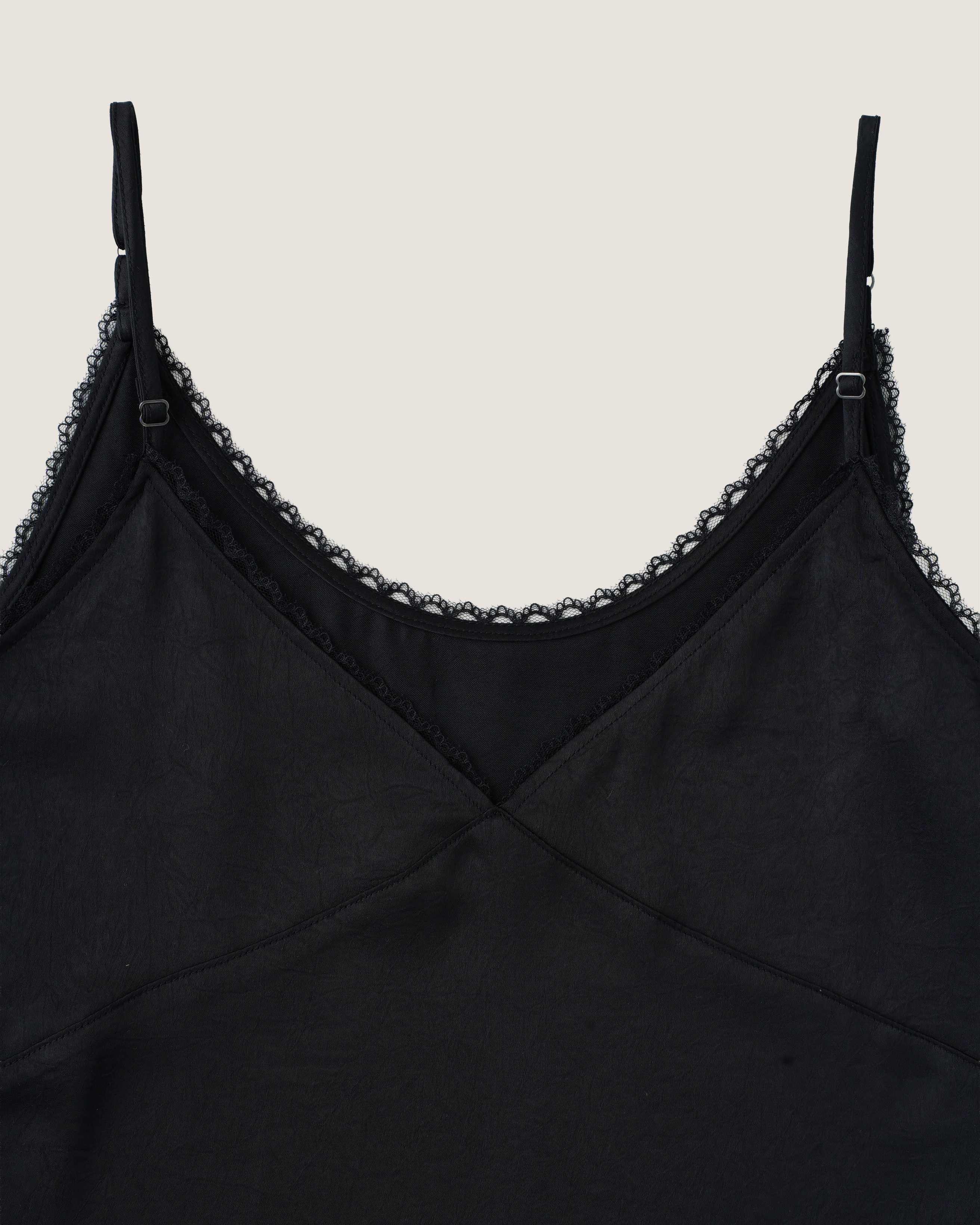蕾絲滾邊細節,領口與肩帶以細緻蕾絲收邊,在簡約之中,藏著一點輕柔的性感。