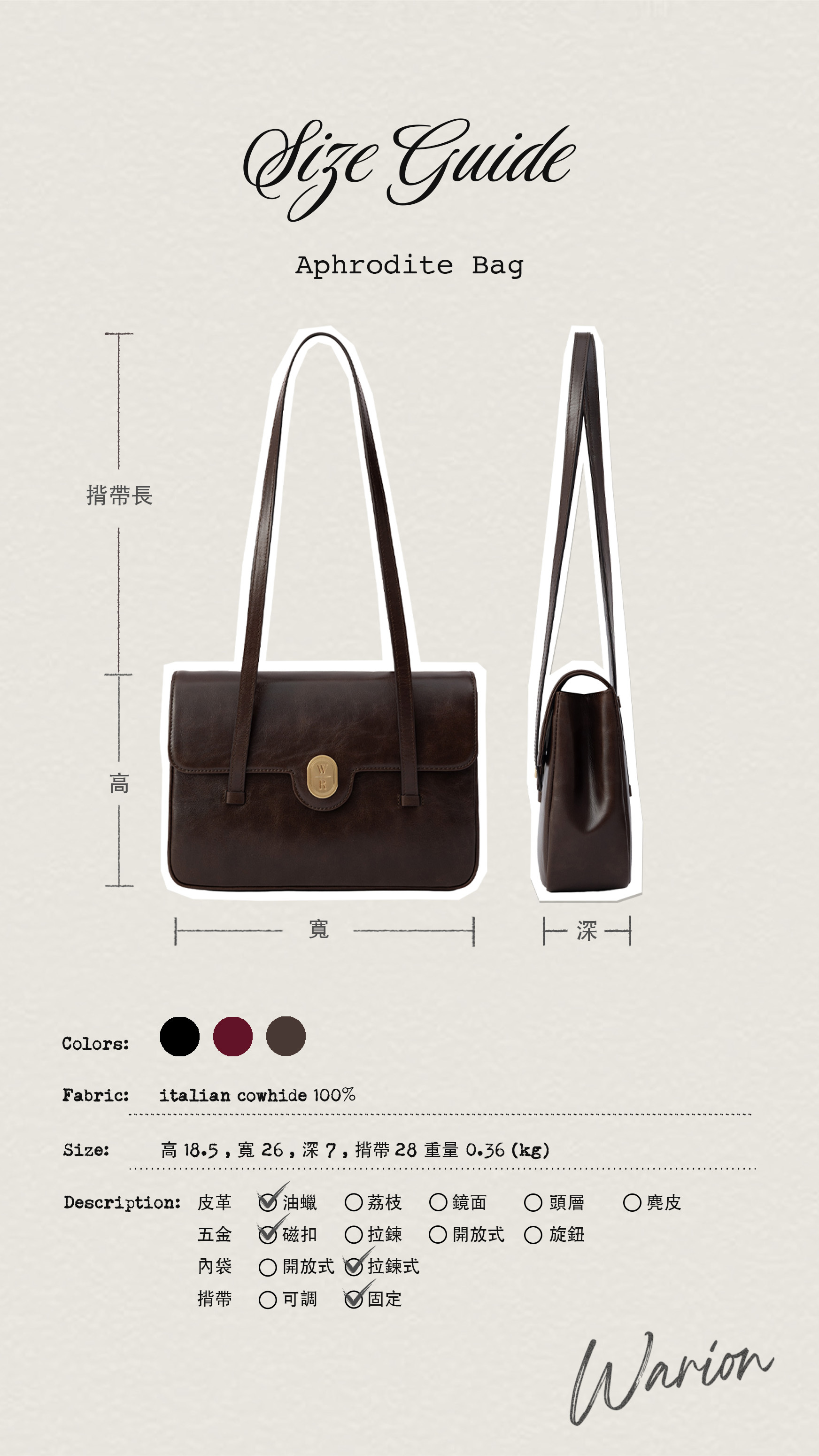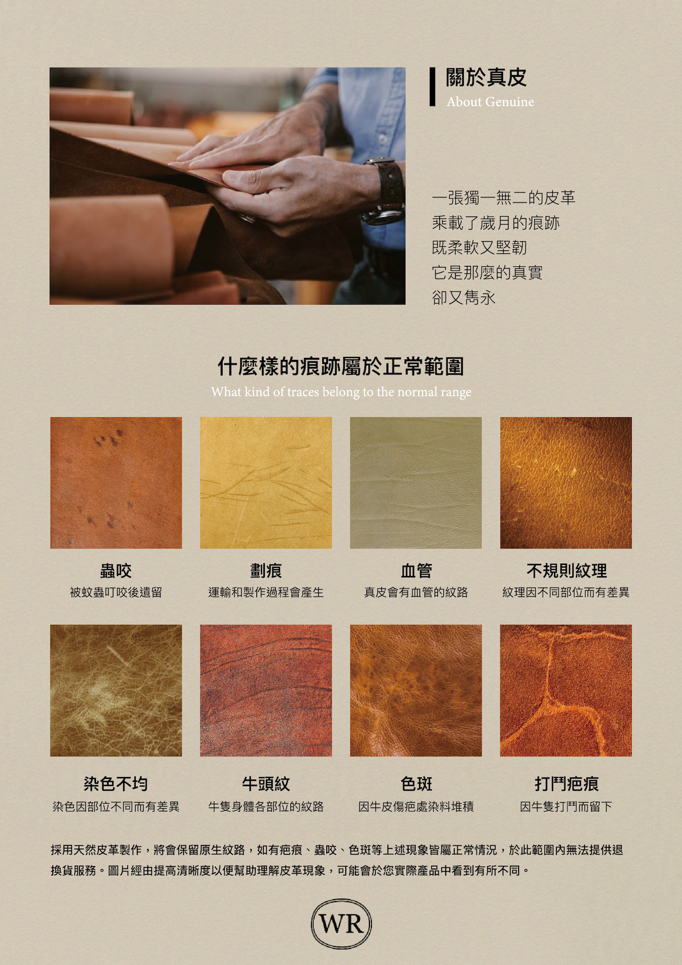 -使用經過最少加工的皮革,皮革的自然痕跡(皺紋、筋腱、畫痕、小斑點等)可能是可見的。