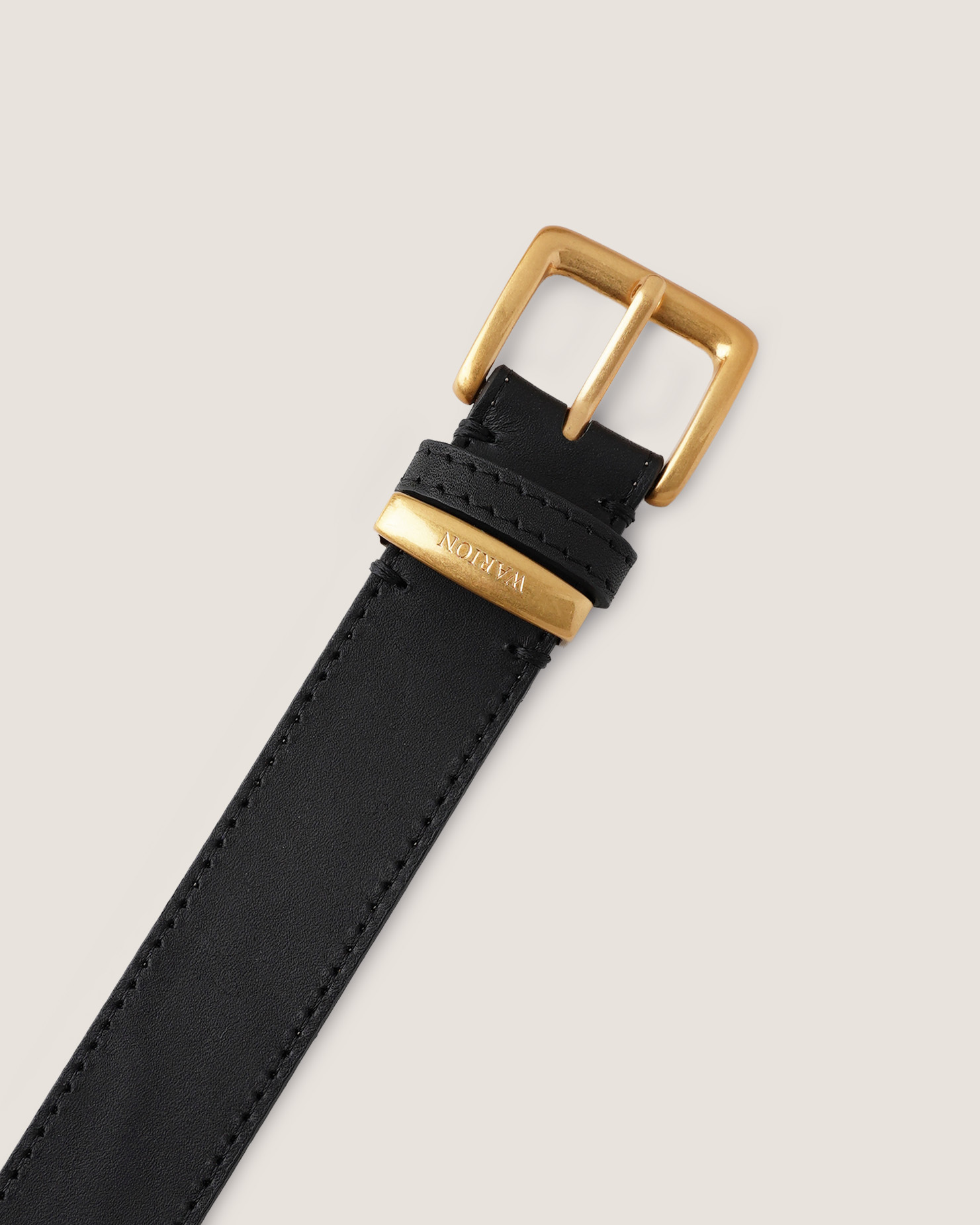 黃銅色金屬扣飾帶有年代感的啞光質地,上面刻著WARION標記,象徵著品牌的細膩。