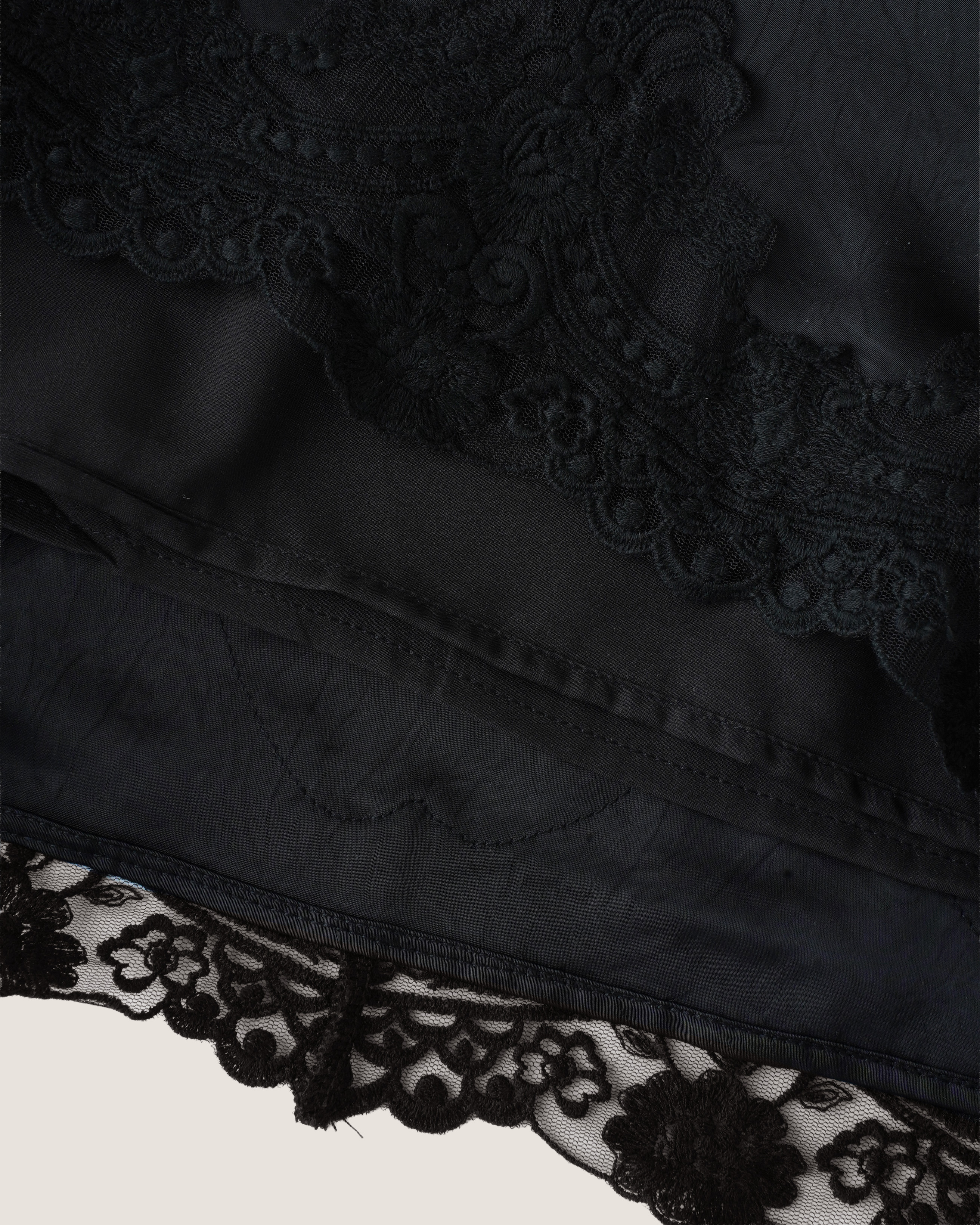 具備細膩光澤的絲滑緞面面料,輕盈舒適。裙擺處巧妙地拼接了細緻的花邊蕾絲,纖細的邊緣若隱若現,在走動間展現出令人心動的浪漫細節。