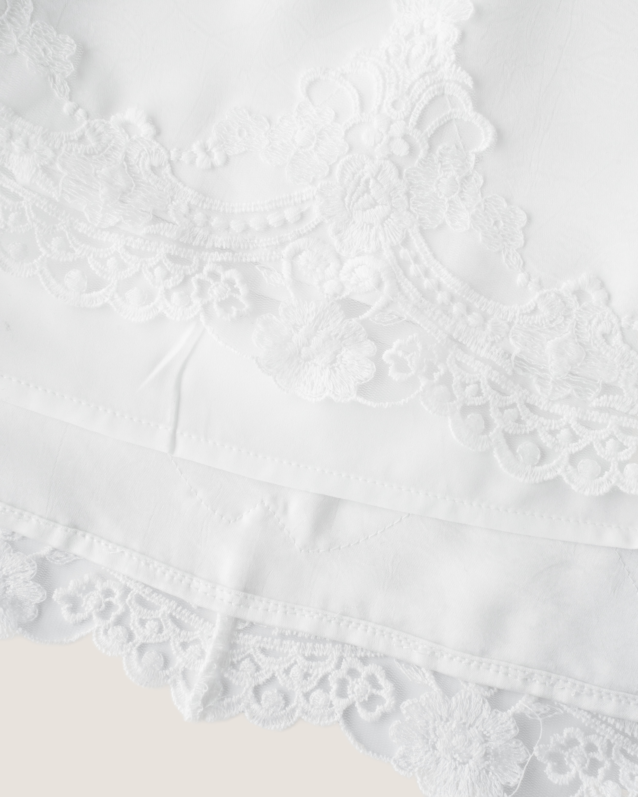 具備細膩光澤的絲滑緞面面料,輕盈舒適。裙擺處巧妙地拼接了細緻的花邊蕾絲,纖細的邊緣若隱若現,在走動間展現出令人心動的浪漫細節。