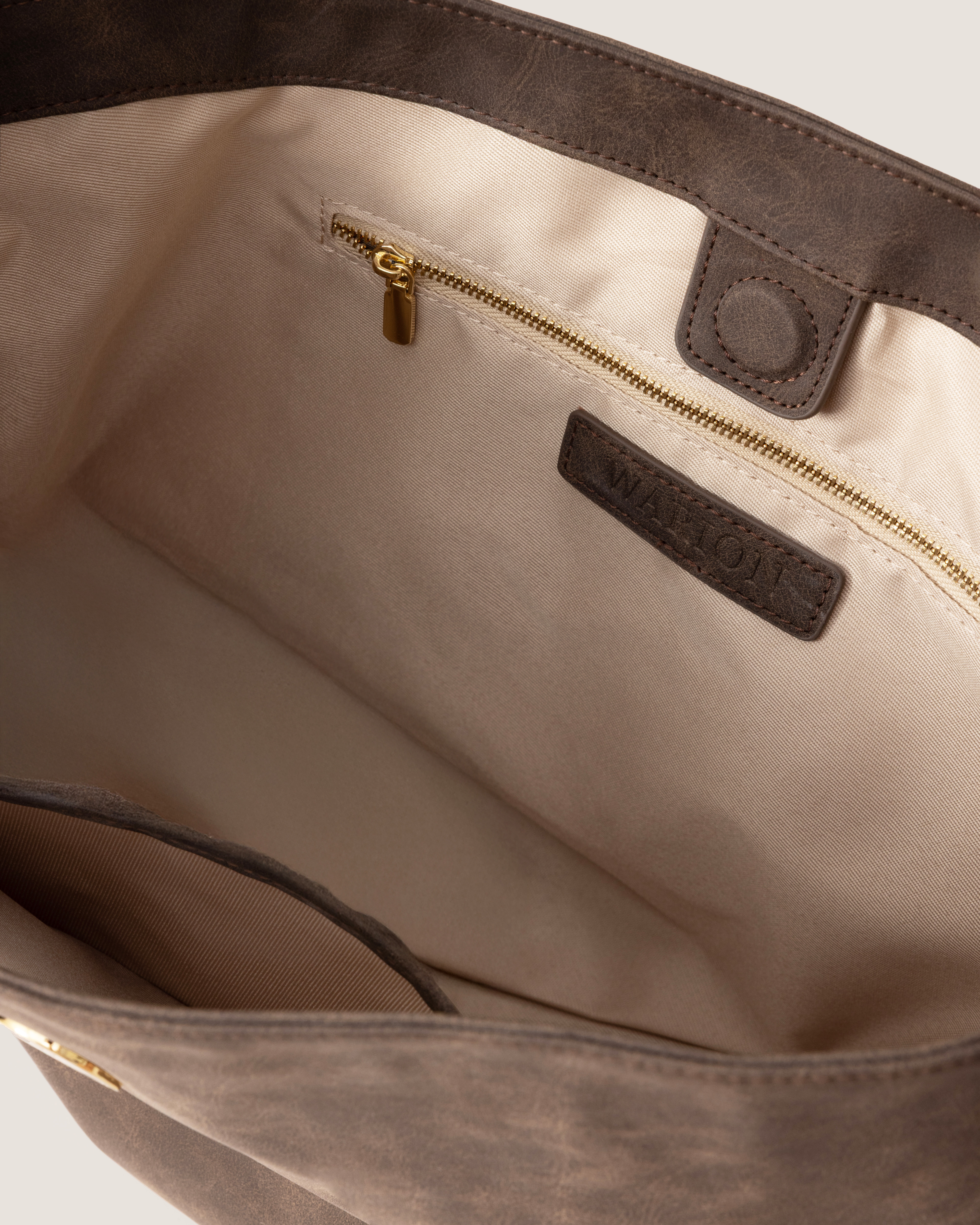 極簡的大容量空間設計,隨心裝載日常所需,且整體極致輕便,實現真正的自在無負擔。包身點綴品牌專屬的金色飾牌,在低調中透出風格;隨附的同材質拉鏈小包,讓妳的私密小物也有了歸屬。