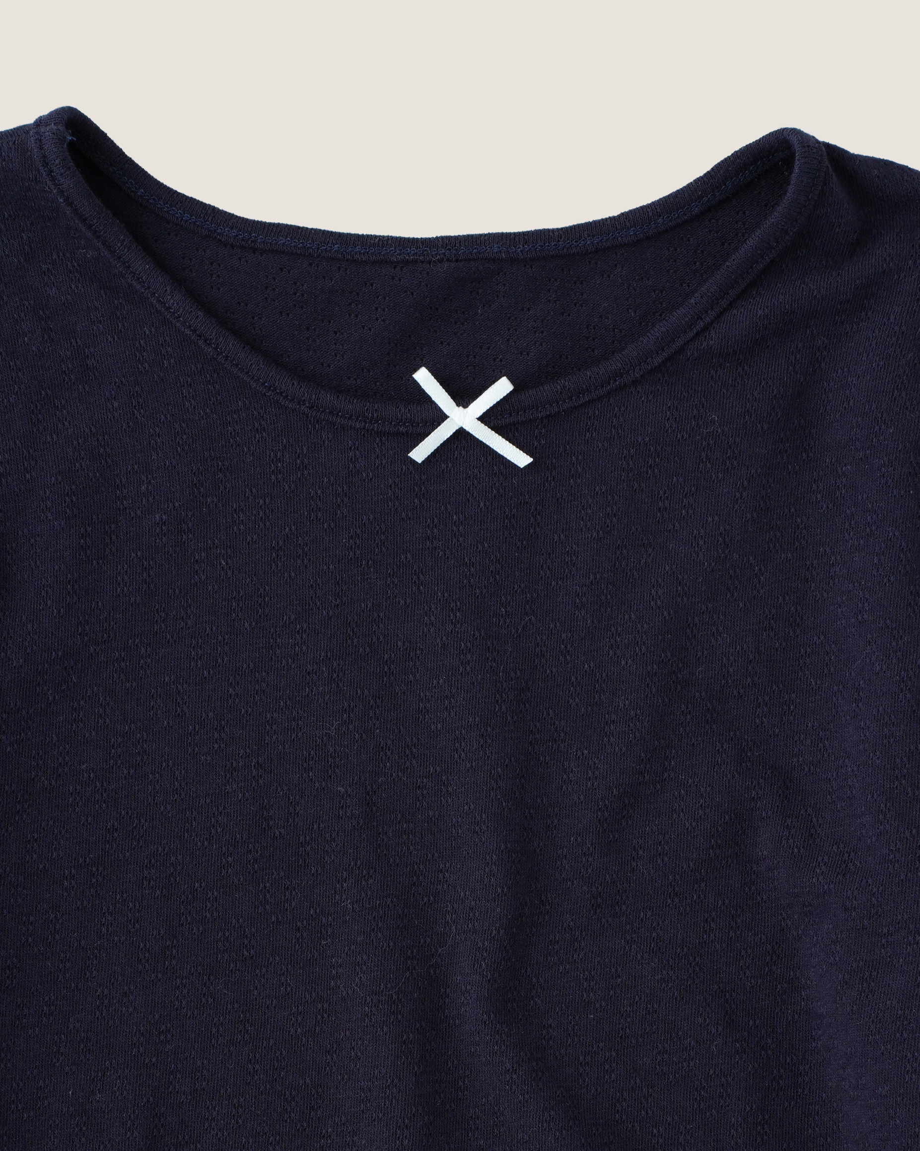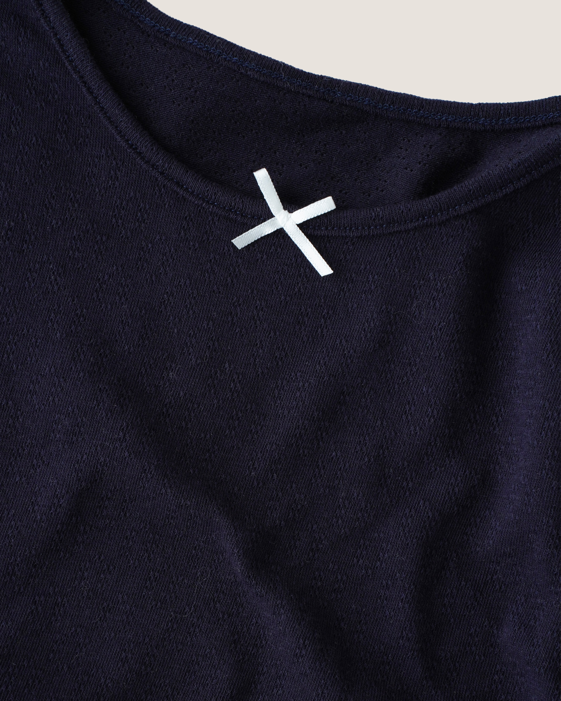 領口中央加入小蝴蝶結裝飾,低調點綴整體造型。