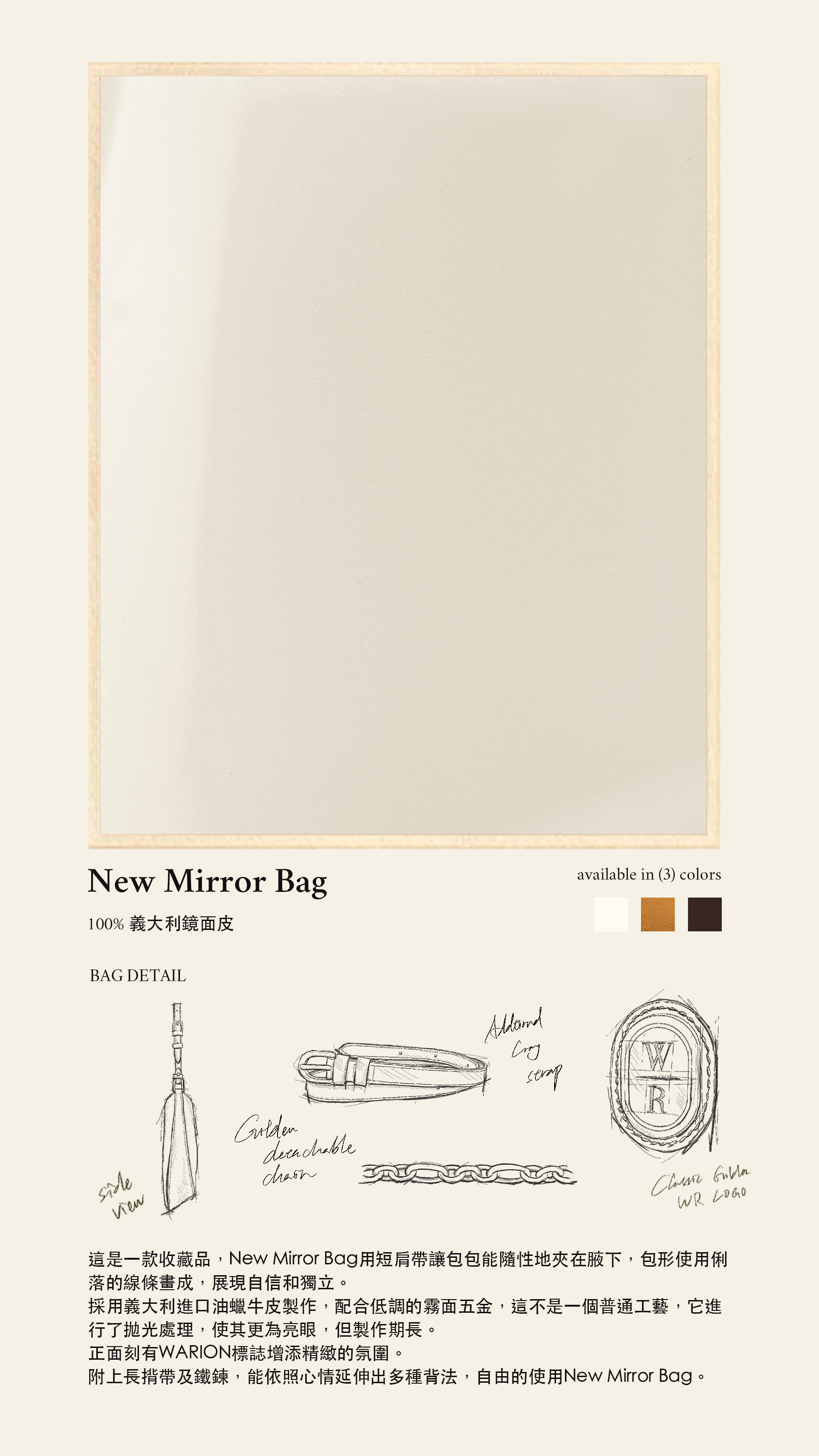 附上長揹帶及鐵鍊,能依照心情延伸出多種背法,自由的使用New Mirror Bag。