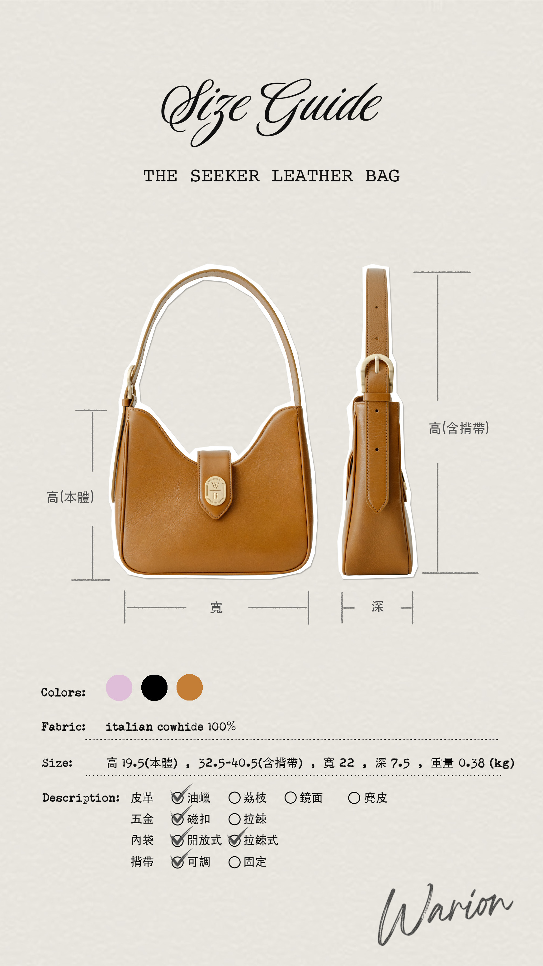 -使用經過最少加工的皮革,皮革的自然痕跡(皺紋、筋腱、畫痕、小斑點等)可能是可見的。